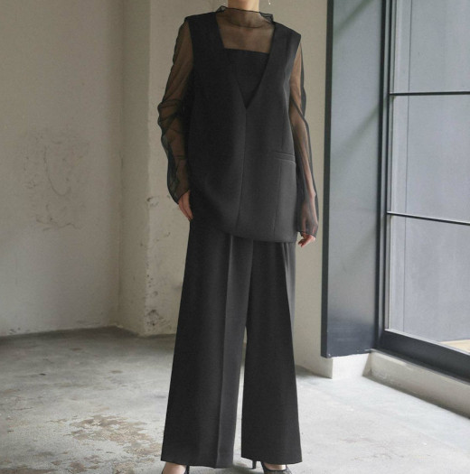 パンツスタイルなら、とろみ素材のブラウスとワイドパンツの組み合わせで、スタイリッシュかつ動きやすい装いになります。