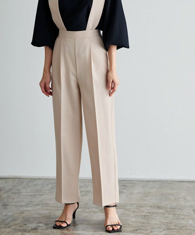 サロペットは、低身長の方が着用すると子供っぽくなってしまいがちですが、モノトーンでフロントタックであれば、大人な印象を作り出すことができます。
